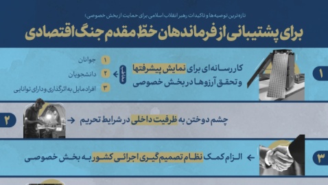 رسانه KHAMENEI.IR در اطلاعنگاشت «برای پشتیبانی از فرماندهان خطّ مقدم جنگ اقتصادی» تازهترین توصیهها و تأکیدات رهبر انقلاب اسلامی برای حمایت از بخش خصوصی را مرور کرده است.