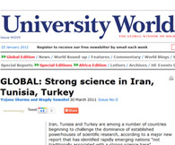 پایگاه اطلاعرسانی University world news میگوید: ایران، تونس و ترکیه در میان کشورهایی هستند که برای تصاحب برتری در میدان رقابت علمی تلاش میکنند. در این میان ایران بیشترین تعداد مقالات علمی را دارد و رشد این کشور از 736 مقاله در سال 1996 به 13238 مقاله در سال 2008 بوده است.