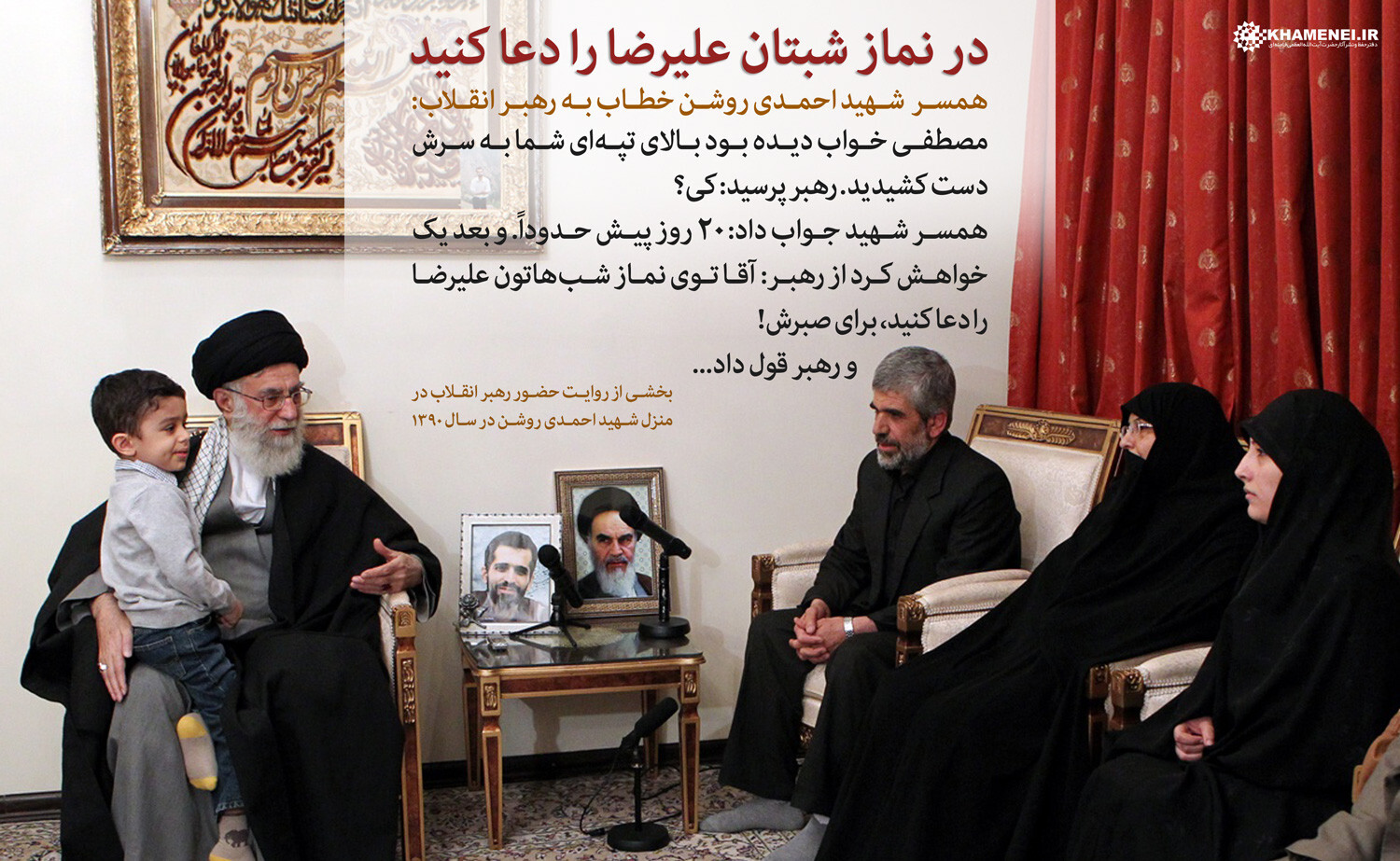 حضرت آیت الله خامنه ای رهبر معظم انقلاب اسلامی امشب (پنجشنبه) با حضور در منزل شهیدان مصطفی احمدی روشن و داریوش رضایی نژاد، دو تن از شهدای نخبه کشور، در فضایی معنوی با خانواده های آنان دیدار و گفتگو کردند.