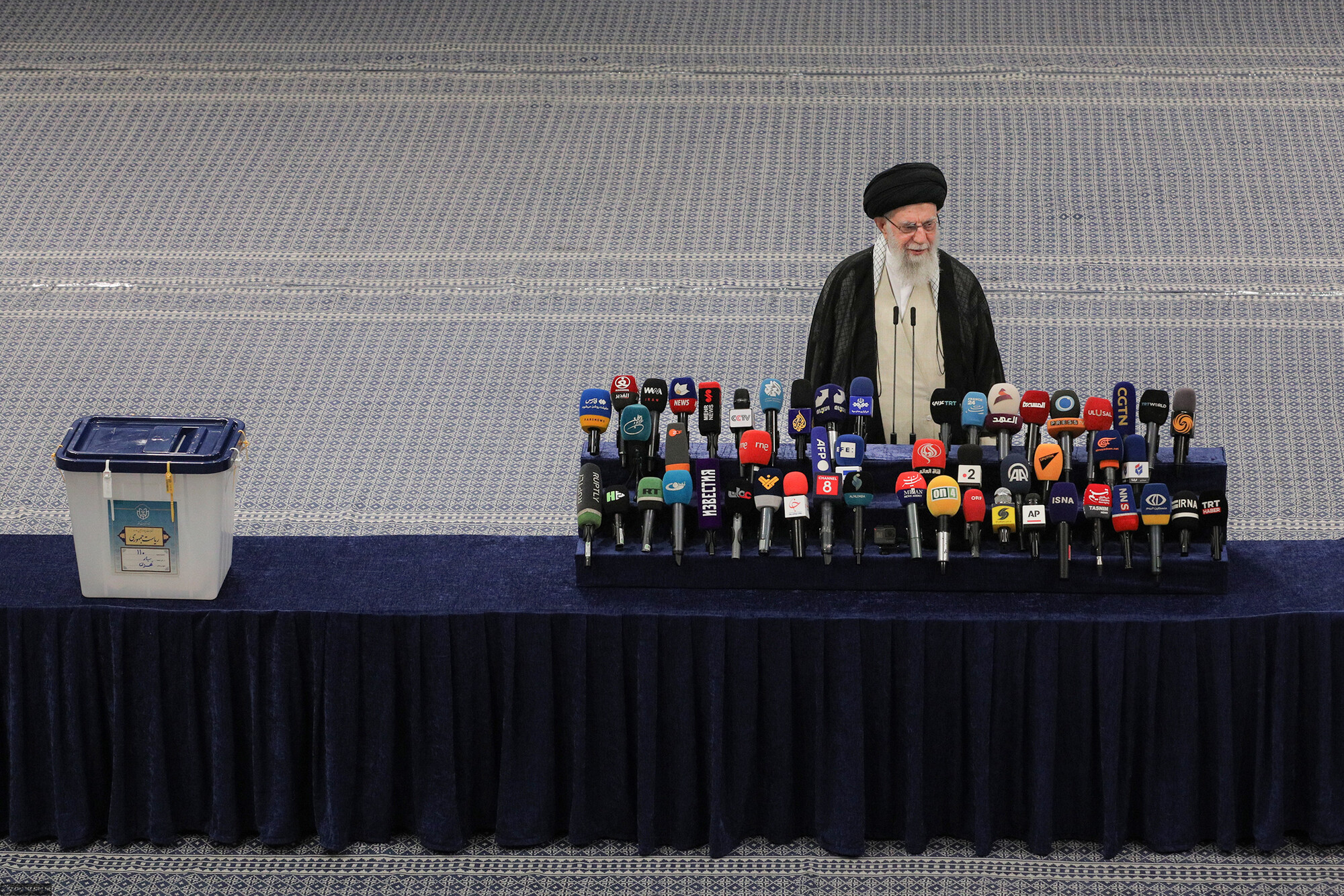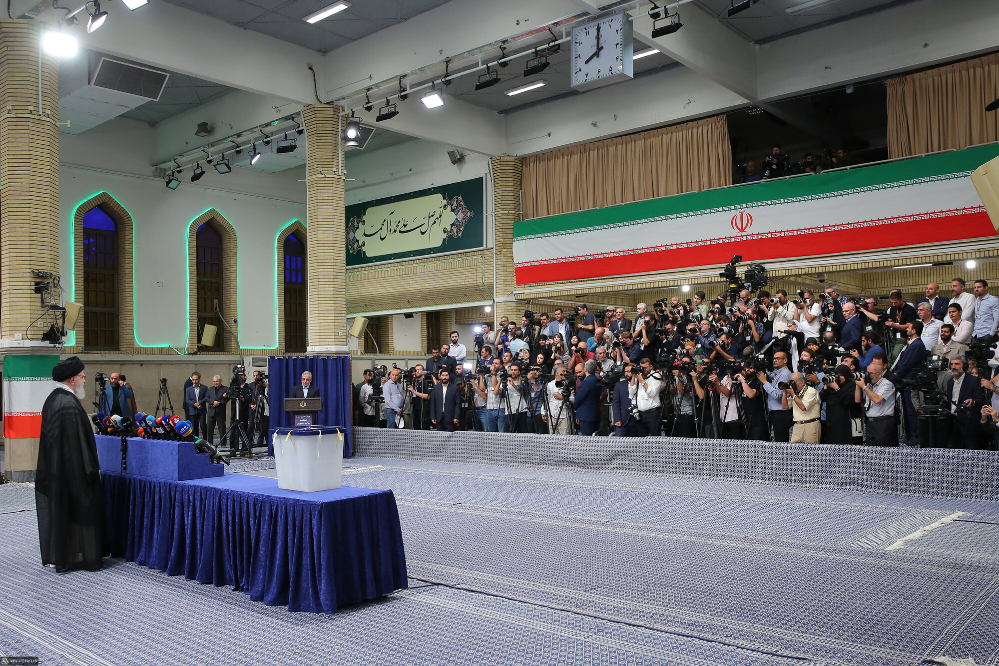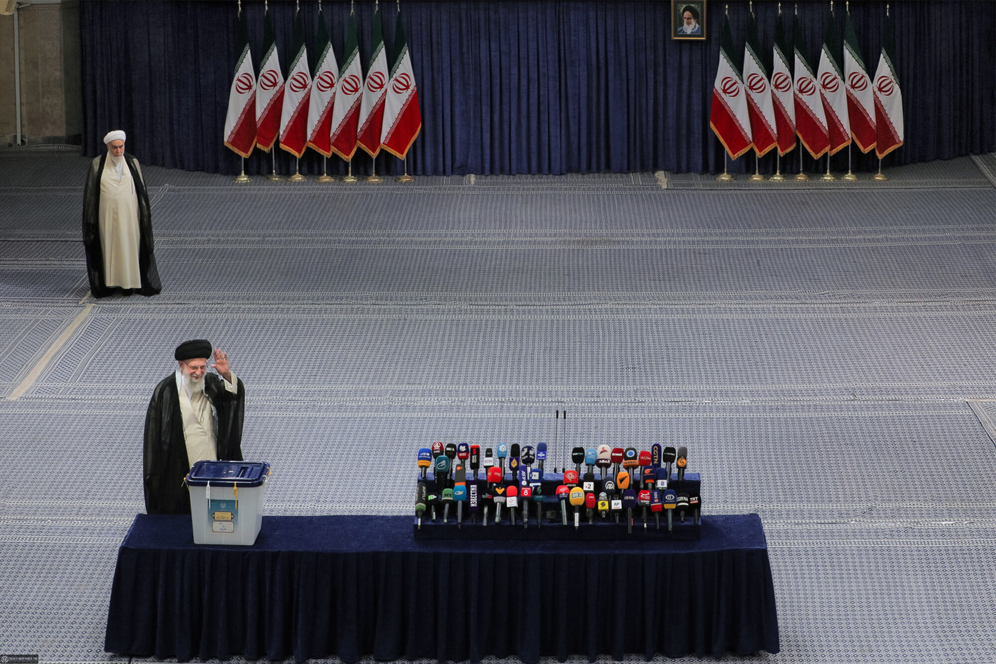 حضرت آیتالله خامنهای رهبر انقلاب اسلامی در اولین دقایق آغاز رأیگیری چهاردهمین دورهی انتخابات ریاست جمهوری با حضور در محل صندوق سیار ۱۱۰ در حسینیهی امام خمینی (رحمهالله)، رأی خود را به صندوق انداختند.
