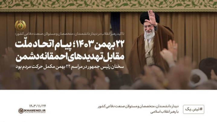 جمعی از مسئولان وزارت دفاع و پشتیبانی نیروهای مسلح، نخبگان صنایع دفاعی، کارشناسان و کارکنان وزارت دفاع، و تعدادی از خانوادههای معظم شهدای صنعت دفاعی کشور، صبح امروز چهارشنبه ۲۴ بهمن ماه با حضرت آیتالله خامنهای، رهبر انقلاب اسلامی دیدار کردند.